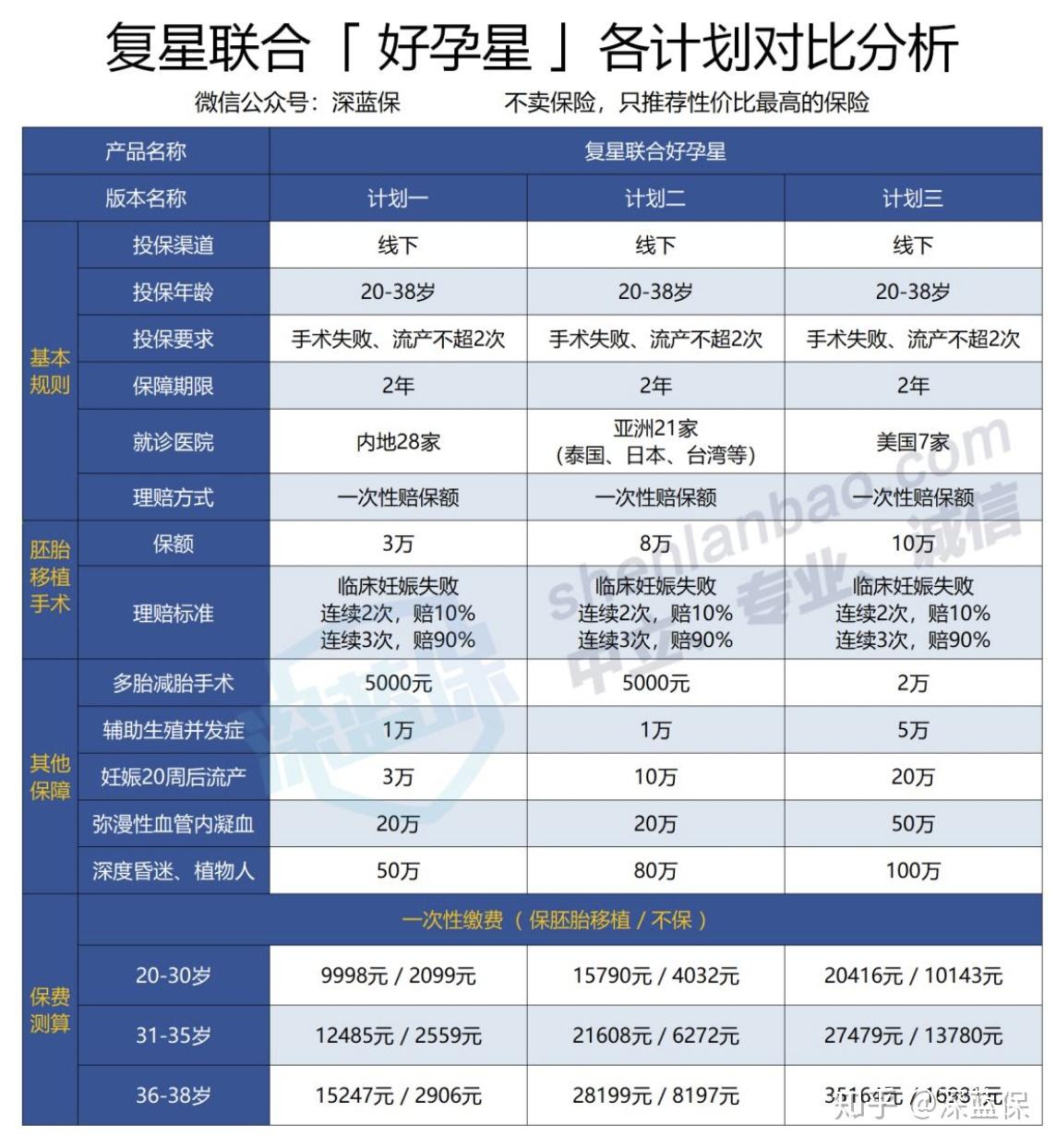 直接說結(jié)論:如果預算不高:眾安試管嬰兒保險的基礎(chǔ)版,30 歲保費 3700 元,如果手術(shù)連續(xù)失敗 3 次,就一次性賠 1.8萬。雖然理賠門檻較高,但多少能彌補一些費用。如果看重全面保障:復星好孕星是保障兩年的,手術(shù)失敗兩次就開始賠付,還保減胎、流產(chǎn)、并發(fā)癥等;如果想去亞洲、美國等地做手術(shù),也有相應的計劃可選。如果預算充足:易安易孕保的保額有 50 萬,一年內(nèi)不限次數(shù)報銷,但是保費也要貴不少。不過這款產(chǎn)品不保第 3 代試管嬰兒技術(shù)。