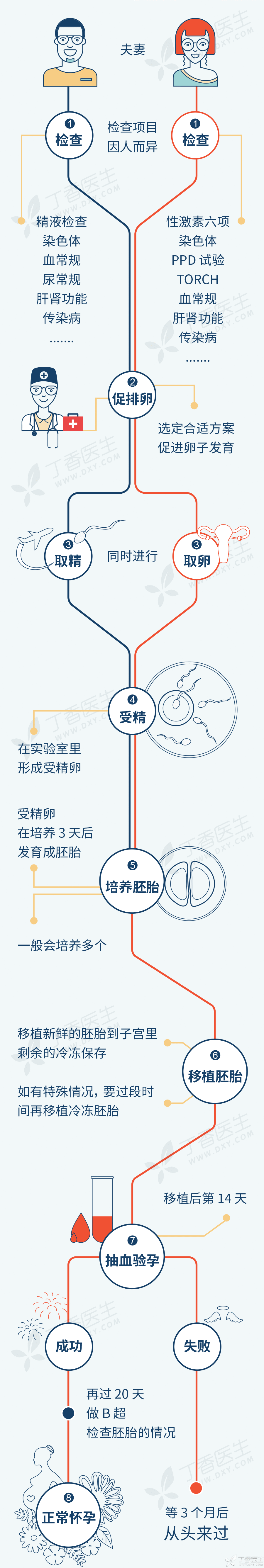 雖然種類有這么多,但實(shí)際上試管嬰兒整體的操作流程是差不多的,為了讓大家看的方便,丁香醫(yī)生找來(lái)了設(shè)計(jì)組的小姐姐做了個(gè)流程圖,讓大家保存起來(lái)看: